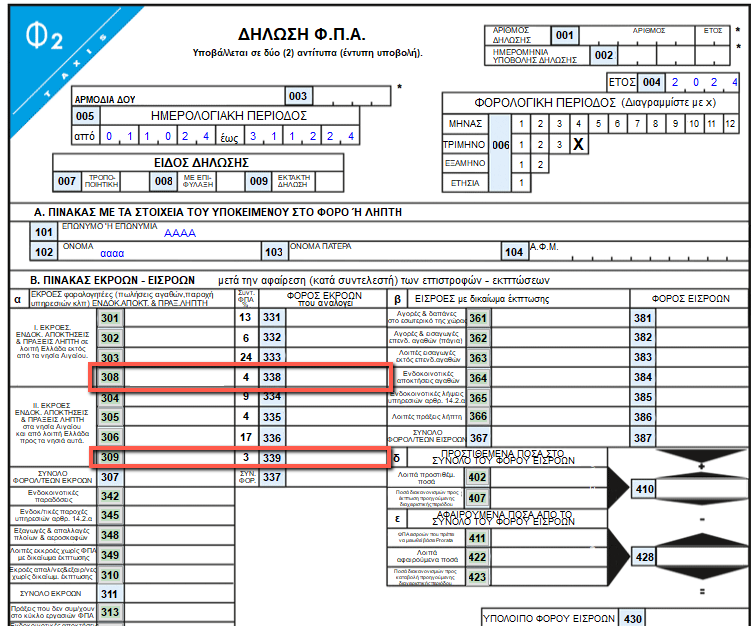 3. Για τις δηλώσεις ΦΠΑ οι οποίες αφορούν φορολογικές περιόδους από 1/1/2022 έως 31/12/2023, η Ανεξάρτητη Αρχή Δημοσίων Εσόδων (ΑΑΔΕ) προσυμπληρώνει τις κατηγορίες εκροών και εισροών με τους αντίστοιχους φόρους στους σχετικούς κωδικούς των πινάκων της δήλωσης ΦΠΑ βάσει των δεδομένων που διαβιβάζονται στην ψηφιακή πλατφόρμα myDATA της ΑΑΔΕ, και του χαρακτηρισμού αυτών, σύμφωνα με τις εκάστοτε ισχύουσες αποφάσεις.