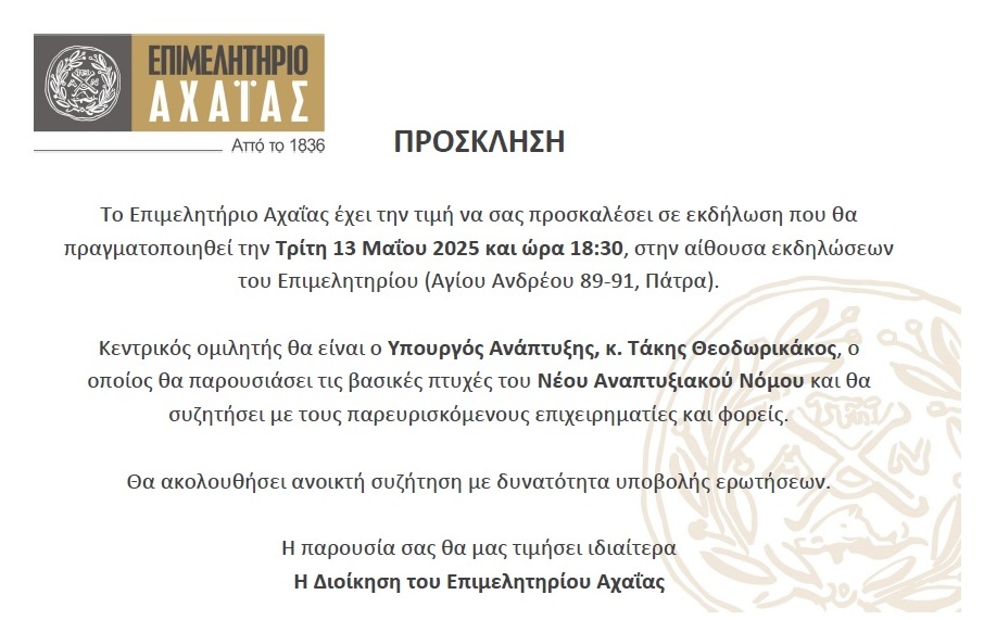 Ο ΥΠΑΝ κ. ΘΕΟΔΩΡΙΚΑΚΟΣ, στις 13/5/2025 παρουσιάζει τον Νέο Αναπτυξιακό Νόμο… στο Επιμελητήριο Αχαϊας