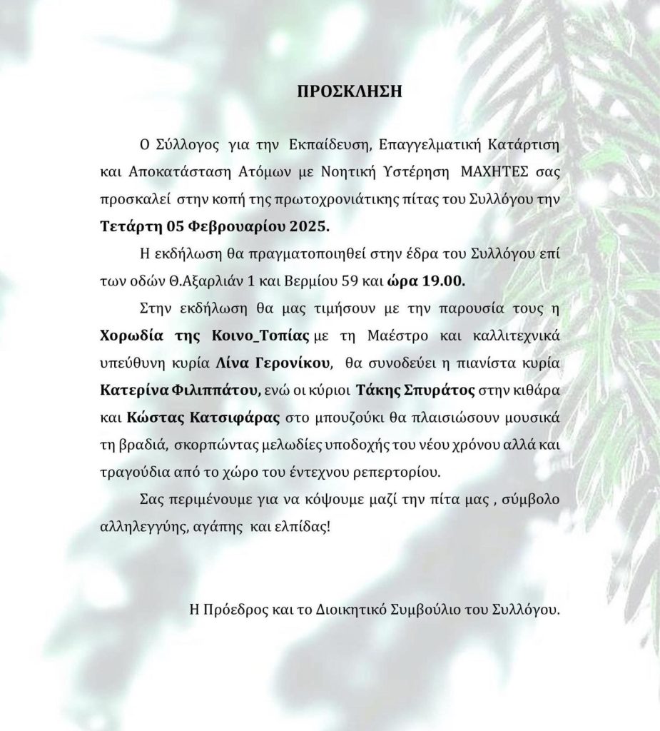 ΠΡΟΣΚΛΗΣΗ: Κοπή της Πρωτοχρονιάτικης πίτας του συλλόγου “ΜΑΧΗΤΕΣ” 3 Φεβ, 2025 Προηγούμενο Ξεκίνησε η διαδικασία χορήγησης δανείων μέσω του Ταμείου Μικροπιστώσεων Επόμενο Πρόσκληση για την κοπή πίτας του Συνδέσμου ηλεκτρολόγων Αιγιαλείας και Καλαβρύτων