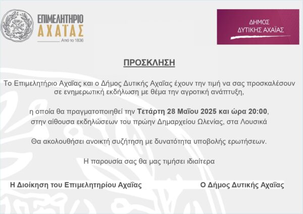 ΕΝΗΜΕΡΩΤΙΚΗ ΕΚΔΗΛΩΣΗ με θέμα την ΑΓΡΟΤΙΚΗ ΑΝΑΠΤΥΞΗ Post Thumbnail 26 Μάι, 2025 ΕΝΗΜΕΡΩΤΙΚΗ ΕΚΔΗΛΩΣΗ με θέμα την ΑΓΡΟΤΙΚΗ ΑΝΑΠΤΥΞΗ Περισσότερα