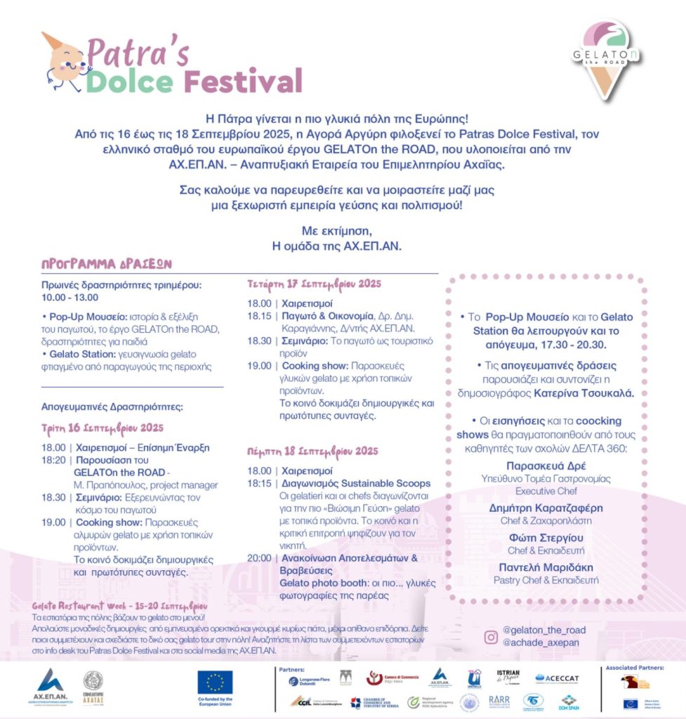 Patras Dolce Festival: Γεύσεις και πολιτισμός συναντούνται στην Αγορά Αργύρη-Ο ελληνικός σταθμός του ευρωπαϊκού έργου GELATOn the ROAD, σας περιμένει!